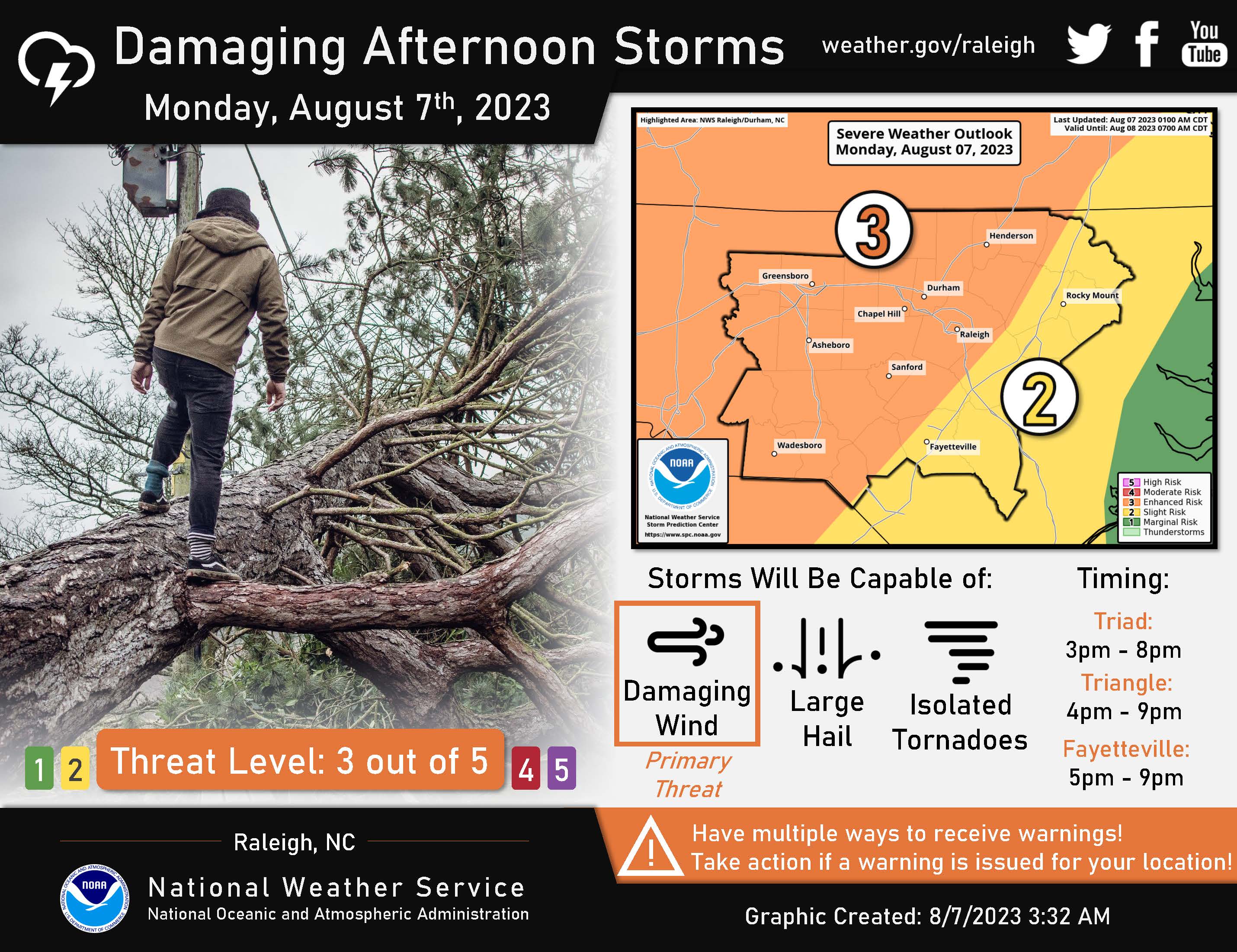 CARRBORO, N.C. -- According to the National Weather Service, there is an Enhanced Risk (level 3 out of 5) for strong to severe thunderstorms this afternoon (Monday, Aug. 7) into the early evening hours. Damaging straight-line winds will be the primary threat with secondary hazards of large hail and tornadoes (which will should be more isolated in nature).